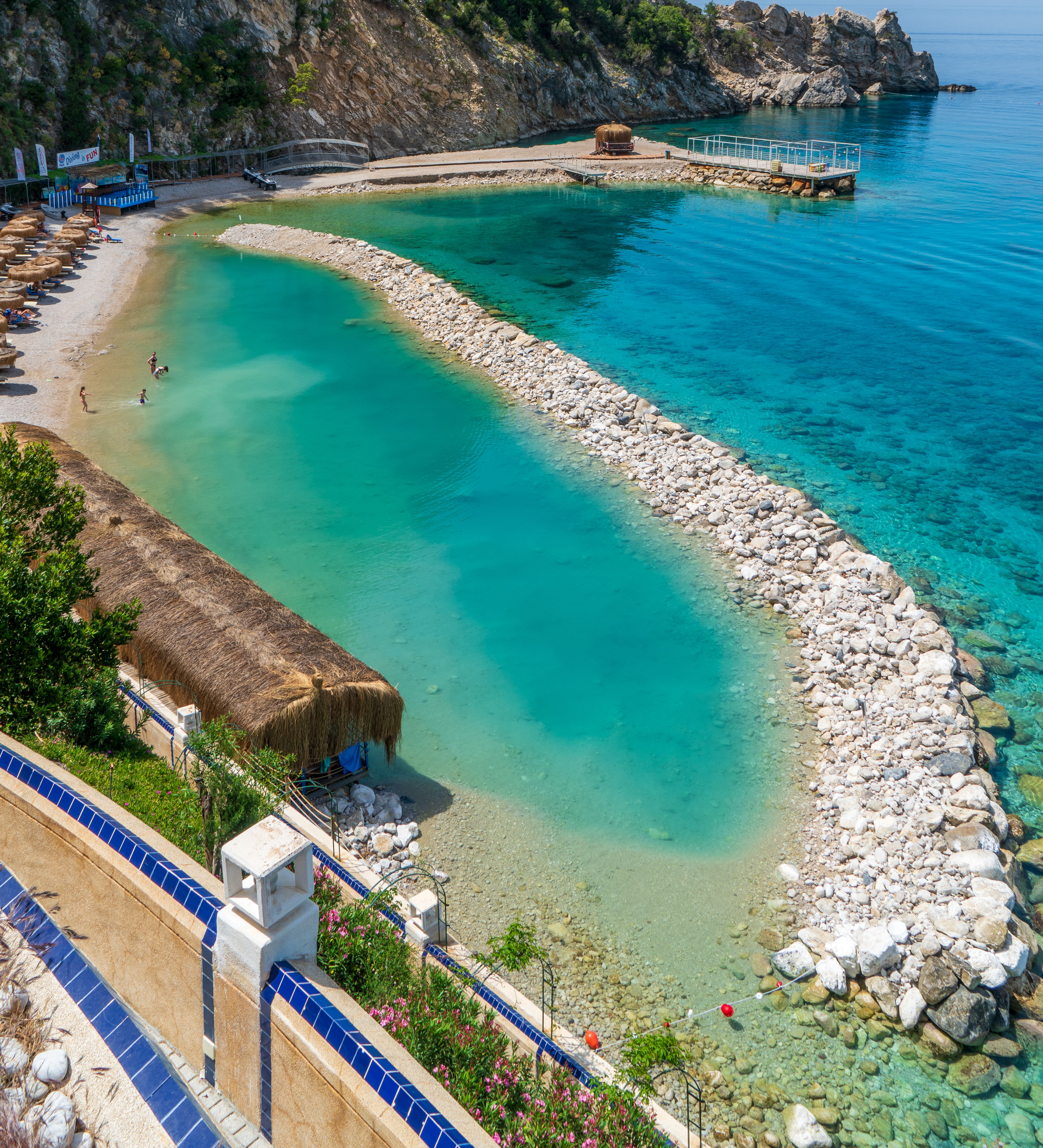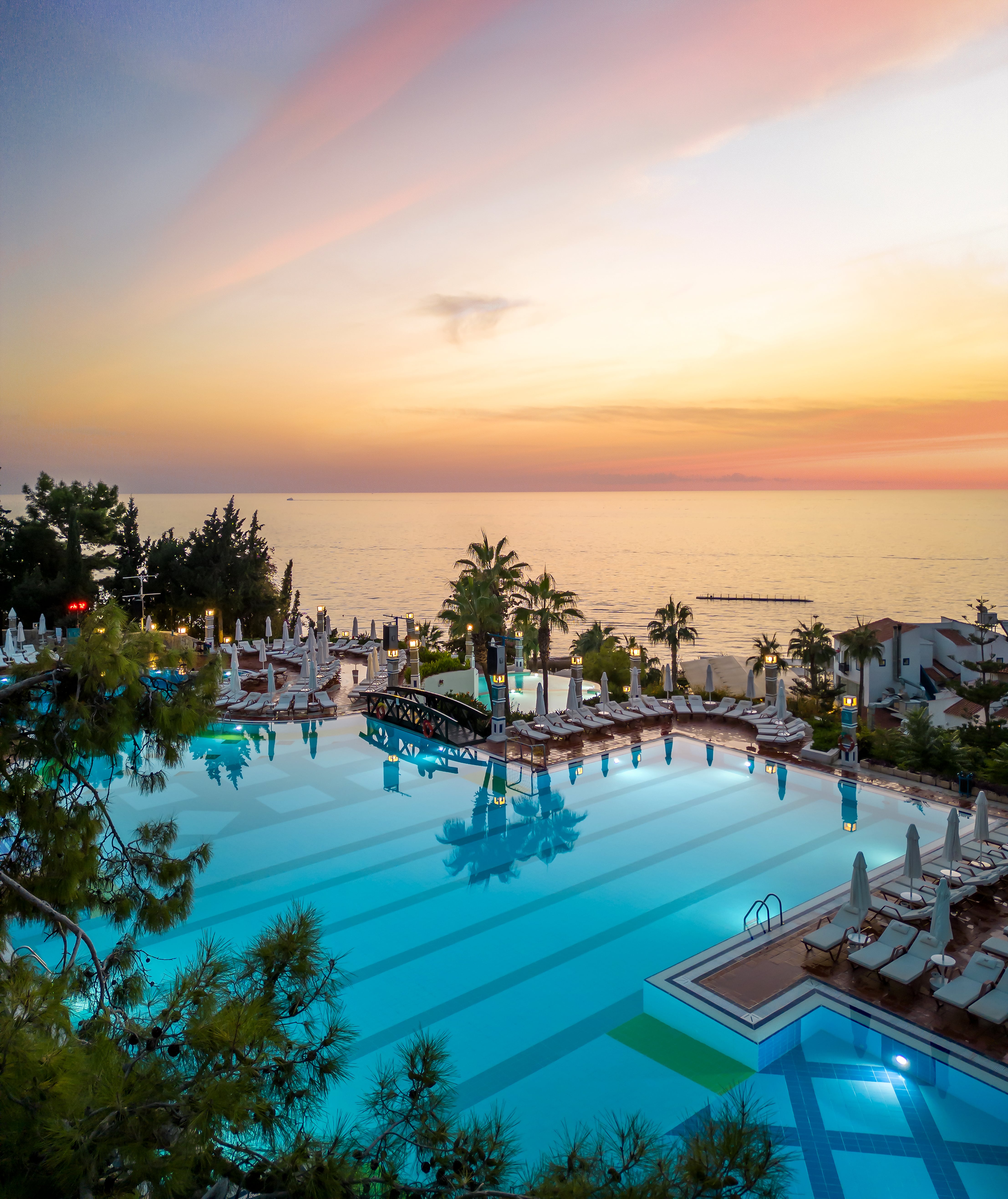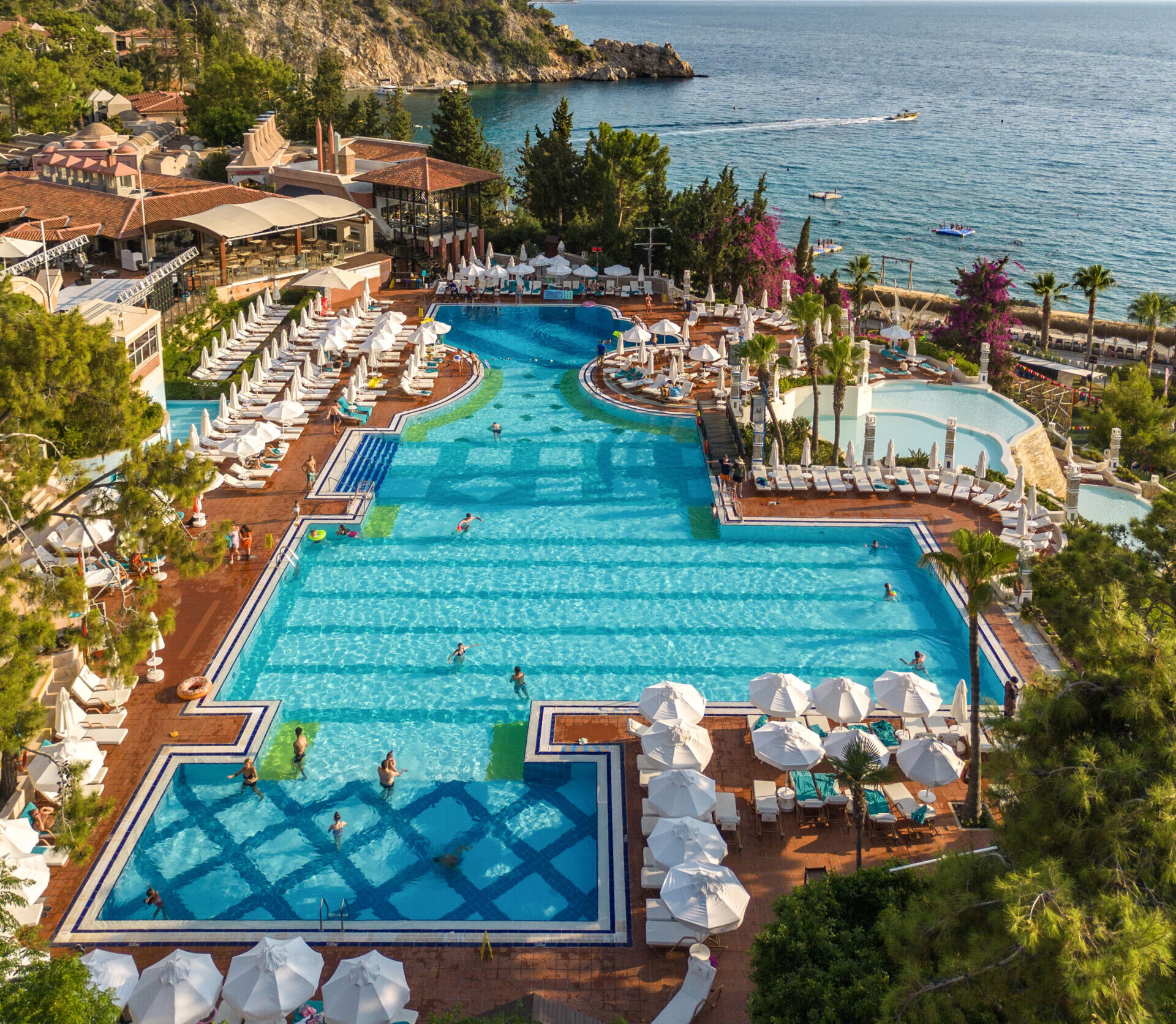 Die Pools von Liberty Lykia mit Panoramablick auf das Mittelmeer sind ideal für ein erfrischendes Badeerlebnis, während die natürlichen Strände unendliche Möglichkeiten zum Sonnenbaden und Schwimmen in dieser bunten Welt bieten.