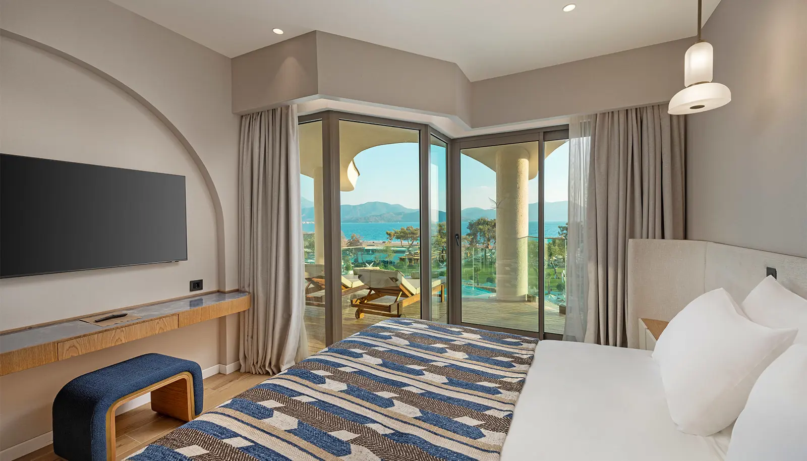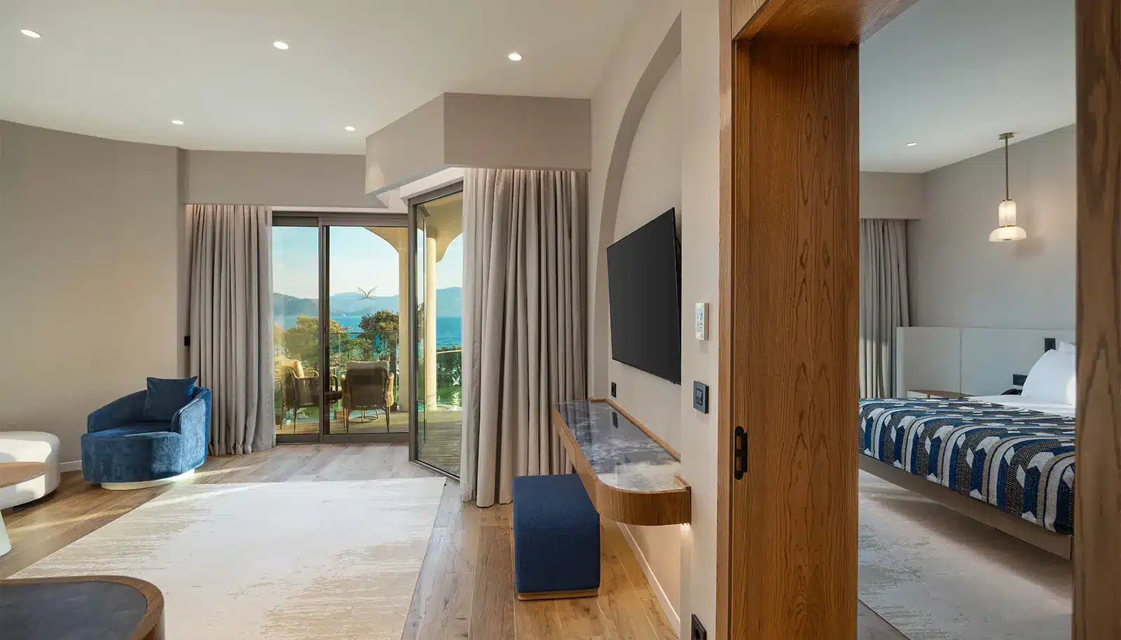 Diese 65 m² große Suite bietet die perfekte Kombination aus Luxus und Eleganz mit herrlichem Meerblick und einem privaten Pool auf der Terrasse. Die Suite verfügt über ein Schlafzimmer, ein Wohnzimmer und zwei moderne Badezimmer. Dank des Schlafsofas im Wohnzimmer bietet sie bequem Platz für bis zu drei Personen.